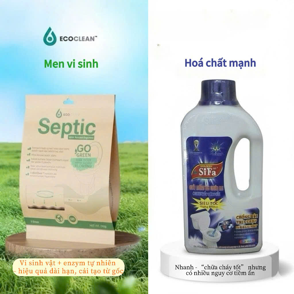 Bài viết này sẽ giúp bạn hiểu rõ sự khác biệt giữa hai loại sản phẩm này, đồng thời gợi ý một giải pháp “sống xanh mà vẫn sạch” – đó là Ecoclean Septic, một loại men vi sinh được đánh giá cao tại Việt Nam hiện nay.