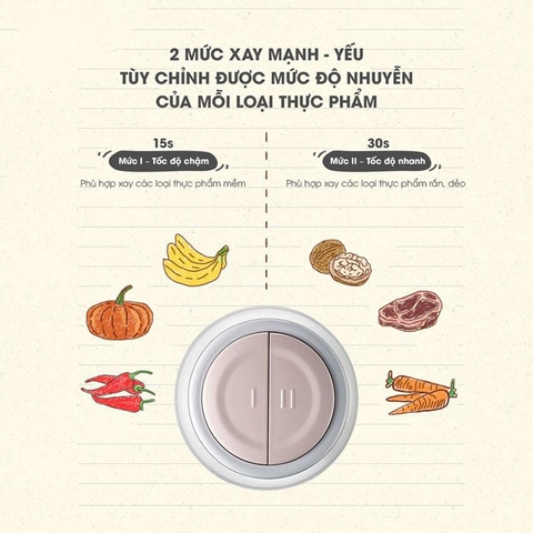 Tích hợp 2 mức xay với mức 1 (xay thực phẩm mềm) và mức 2 (xay thực phẩm rắn, dẻo)