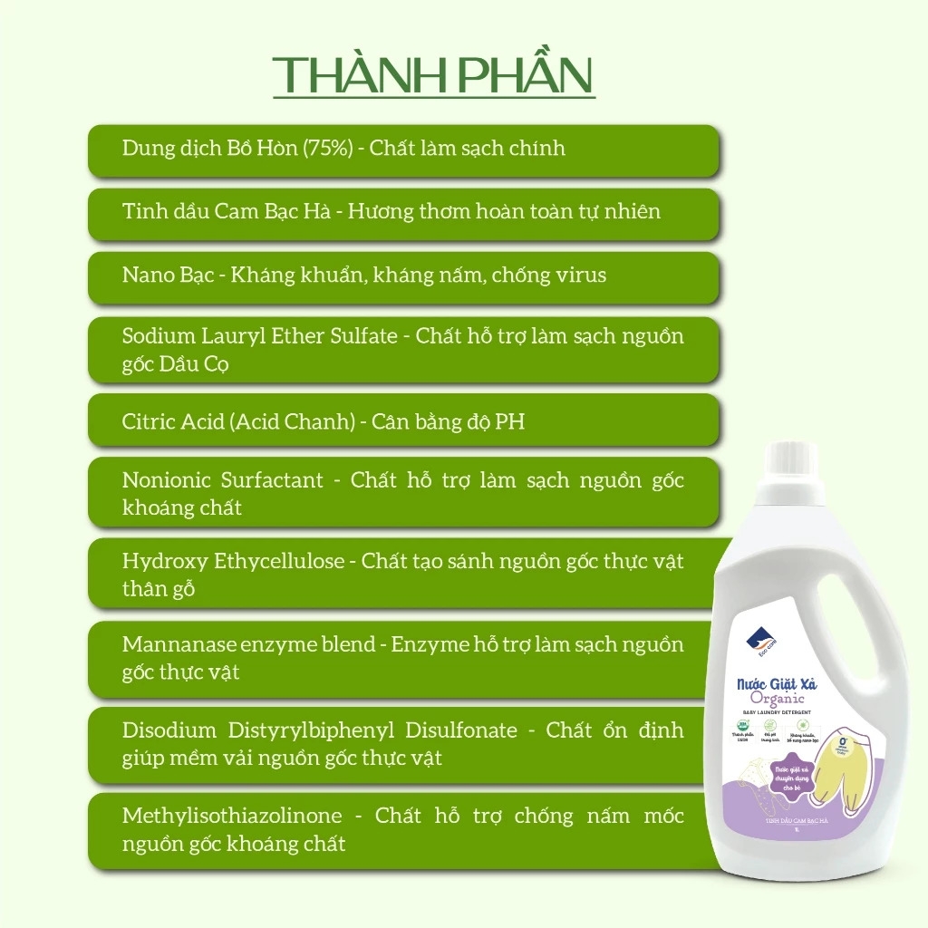 - Sản phẩm được sản xuất bởi công ty Ecocare Việt Nam với thành phần 99% tự nhiên, nguồn gốc thực vật. Vùng nguyên liệu tuyển chọn khắt khe đặt tại nhiều tỉnh thành của Việt Nam.